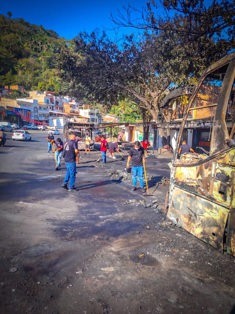 La Dirección de Servicios Eficientes refuerza las labores de apoyo y limpieza en coordinación con autoridades municipales y estatales, tras los bloqueos viales y quema de vehículos registrados el pasado domingo en la ciudad.